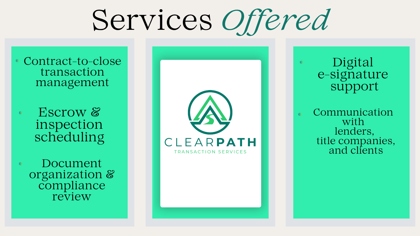 ClearPath Transaction Services provides real estate agents, brokers, and investors with professional transaction coordination services from contract to close. We ensure compliance, organization, and smooth closings nationwide, allowing real estate professionals to focus on client relationships and sales.